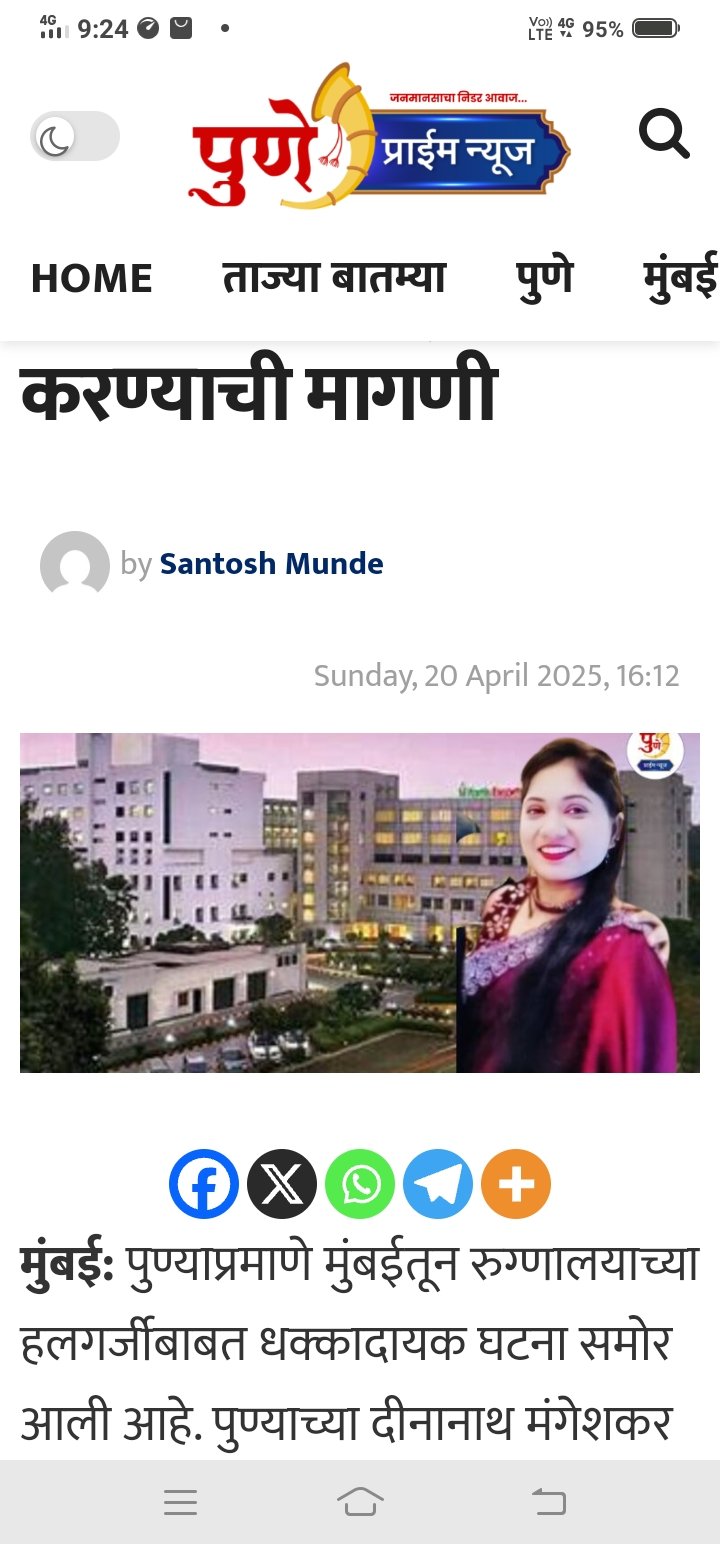 पुण्याप्रमाणे मुंबईतून रुग्णालयाच्या हलगर्जीबाबत धक्कादायक घटना समोर आली आहे . पुण्याच्या दीनानाथ मंगेशकर रुग्णालयात गर्भवती महिलेचा वेळेत उपचार न केल्यामुळे तिचा मृत्यू झाला होता . ही घटना ताजी असतानाच नवी मुंबईत आणखी एका गर्भवतीचा बाळाला जन्म दिल्यानंतर मृत्यू झाला आहे . ही घटना तुर्भे येथे घडली . संगिता खरात असे या मृत महिलेचे नाव आहे . संगीता यांचा नवी मुंबई महानगरपालिका रुग्णालयात डॉक्टरांच्या हलगर्जीपणामुळे मृत्यू झाला असा आरोप रुग्णाच्या नातेवाईकांनी केला आहे . यामुळे सर्वत्र एकच खळबळ