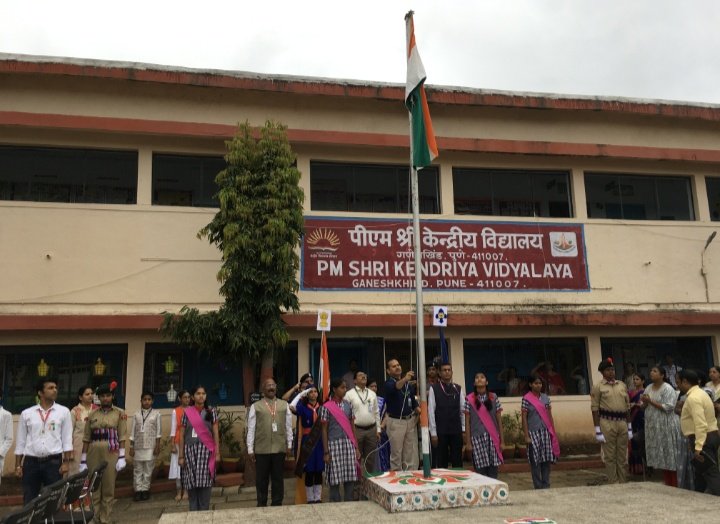 पी.एम. श्री केन्द्रीय विद्यालय, गणेशखिंड, पुणे – ०७ येथे भारताचा ७९ वा स्वातंत्र्यदिन दिनांक १५ ऑगस्ट रोजी मोठ्या उत्साहात आणि देशभक्तीच्या वातावरणात साजरा करण्यात आला. शाळेच्या परिसराची पताका आणि फुग्यांनी सुंदर सजावट करण्यात आली होती, ज्यामुळे संपूर्ण वातावरणात अभिमान आणि आनंदाची भावना पसरली.