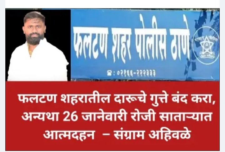 या मागणीसंदर्भात आज फलटण शहर पोलिसांना लेखी निवेदन देण्यात आले . निवेदनात दारुचे गुत्ते तात्काळ बंद करावेत , संबंधितांवर कडक कारवाई करावी तसेच शहरात शांतता व सामाजिक सुव्यवस्था राखण्यासाठी ठोस पावले उचलावीत , अशी मागणी करण्यात आली आहे . प्रशासनाने व पोलिसांनी तातडीने दखल घ्यावी , अन्यथा आंदोलन अधिक तीव्र करण्यात येईल , असा इशाराही संग्राम अहिवळे यांनी दिला आहे .
